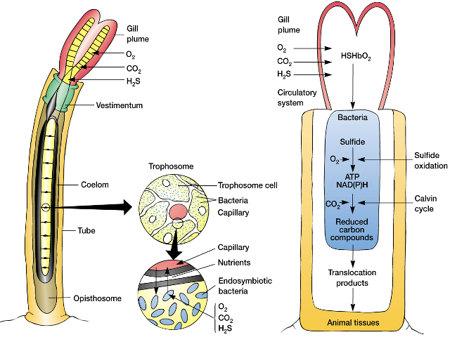 De esta forma, las bacterias del trofosoma y de las branquias, pueden fijar el sulfuro disuelto en el agua y convertirlo en materia orgánica, debido a diferentes reacciones de transformación.