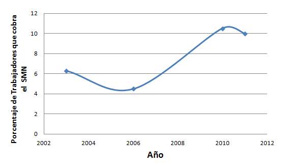 Entre 2003 e 2006, por el contrario, el porcentaje de trabajadores que ganaba el SMN había bajado del 6,2% al 4,5% respectivamente.