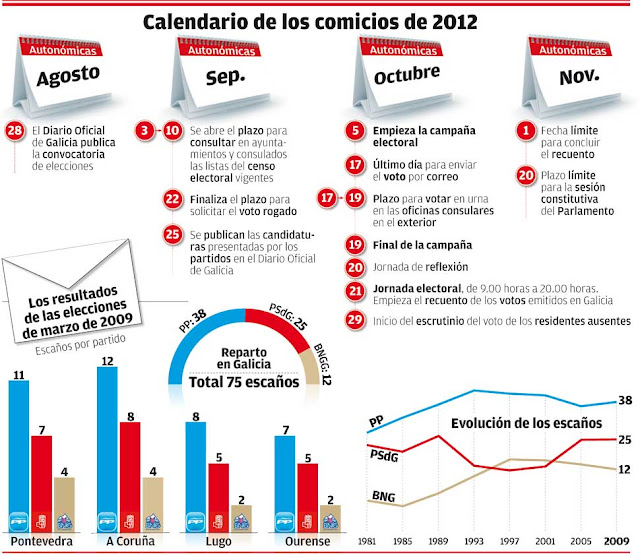 Hasta este mismo año, en todas las elecciones se han contabilizado para las estadísticas del censo electoral tanto a gallegos residentes en la Comunidad como en el extranjero. Bien, incluso el INE daba como siempre el total para estas elecciones (aquí), y la Xunta sin embargo, ofrece datos comparativos basándose sin duda en otro modelo estadístico (aquí). El censo era de 2.696.513. O lo que es lo mismo, unos 5.000 gallegos con derecho a voto más que en 2009. ¿Entonces cómo es posible que el porcentaje de abstención, por ejemplo, sea tan parecido cuando han participado 238.541 gallegos menos? ¿Cómo se puede hablar de un porcentaje de participación del 63,8% cuando utilizando el mismo sistema estadístico de los pasados comicios en realidad es del 54,42%? ¿Cómo se puede hablar de reválida gallega del gobierno del nefasto Rajoy, cuando el PP ha caído un 17,5% en voto?